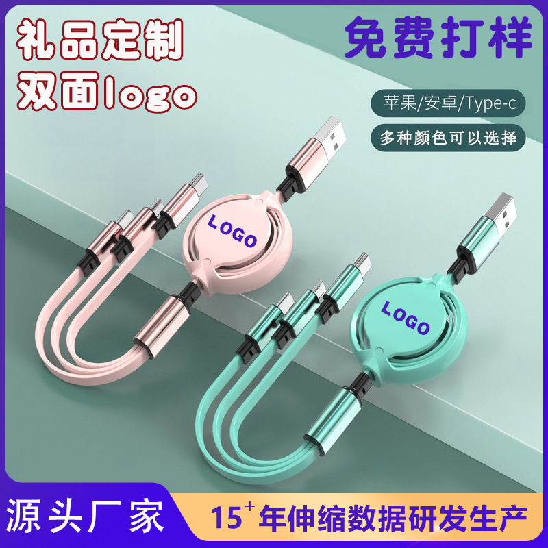 伸缩三合一数据线快充三头一拖三手机充电线活动礼品广告制定爆款