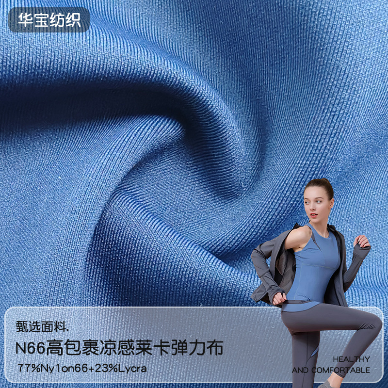 N66高包裹凉感莱卡弹力布77%Ny1on66+23%Lycra高弹性纱线光滑细腻