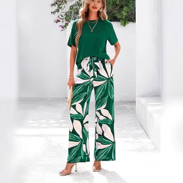 欧美外贸2026亚马逊夏爆品圆领短袖T恤花卉印花腰带长裤休闲套装