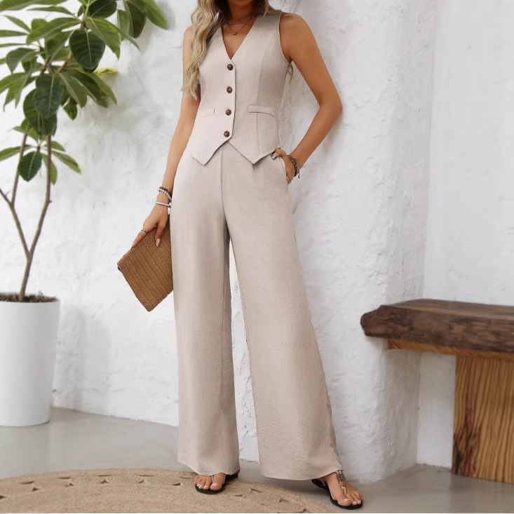 欧美跨境TEMU热卖新款时尚马甲不规则下摆宽松长裤显高休闲套装