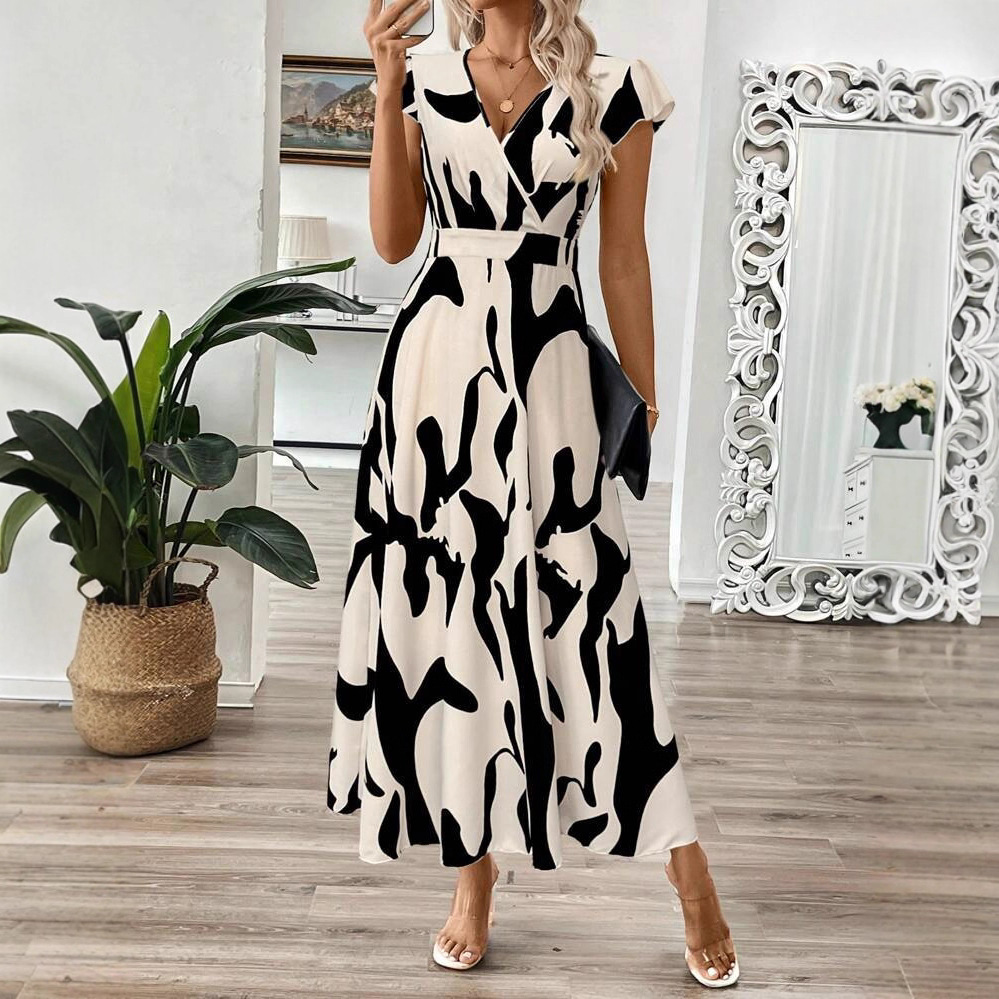 亚马逊欧美跨境新款印花修身显瘦女装深V交叉领短袖休闲连衣裙