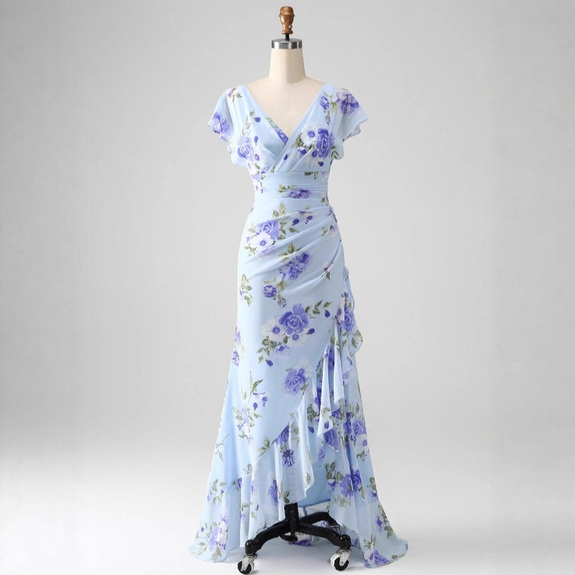 欧美外贸跨境亚马逊蓝色碎花A字荷叶边不对称婚礼宾客礼服连衣裙