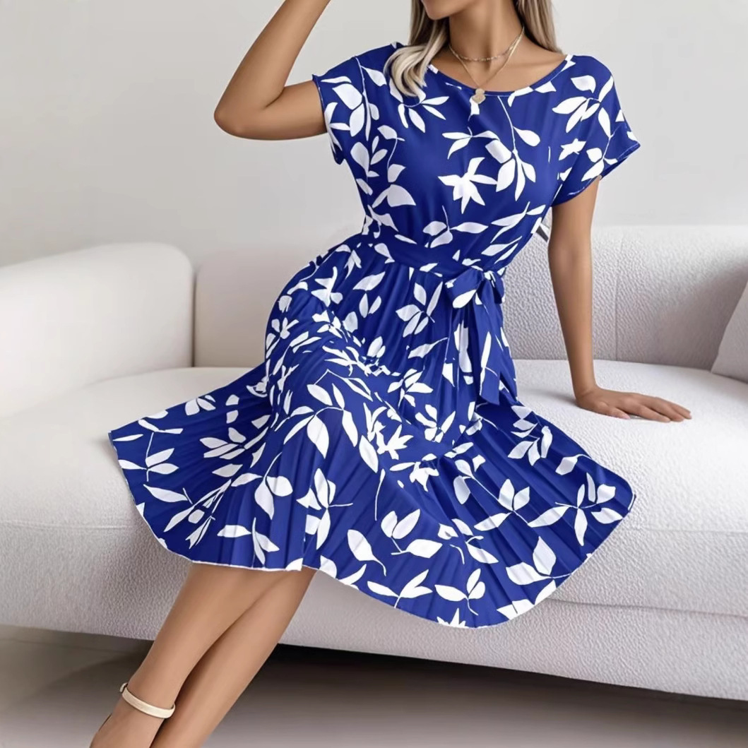 2025欧美跨境亚马逊INS风夏季休闲时尚植物印花百褶裙高腰显瘦