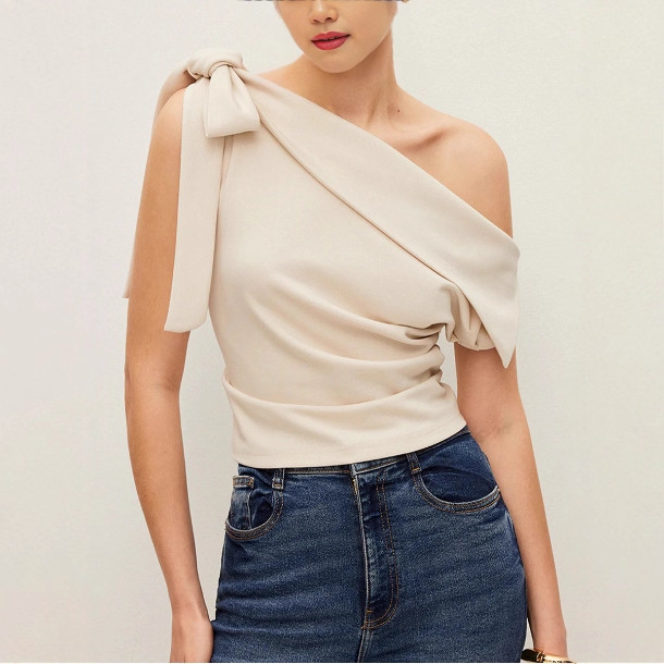 欧美外贸女夏秋新款设计感斜领露肩绑带蝴蝶结百搭显瘦无袖T恤女