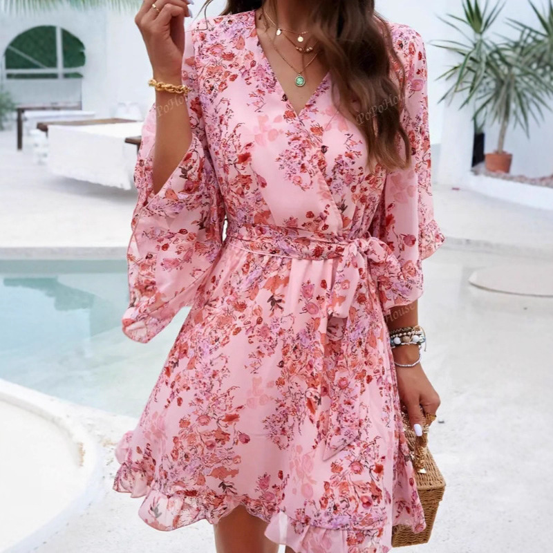 欧美外贸独立站亚马逊热售新款印花V领荷叶边简约度假系带连衣裙