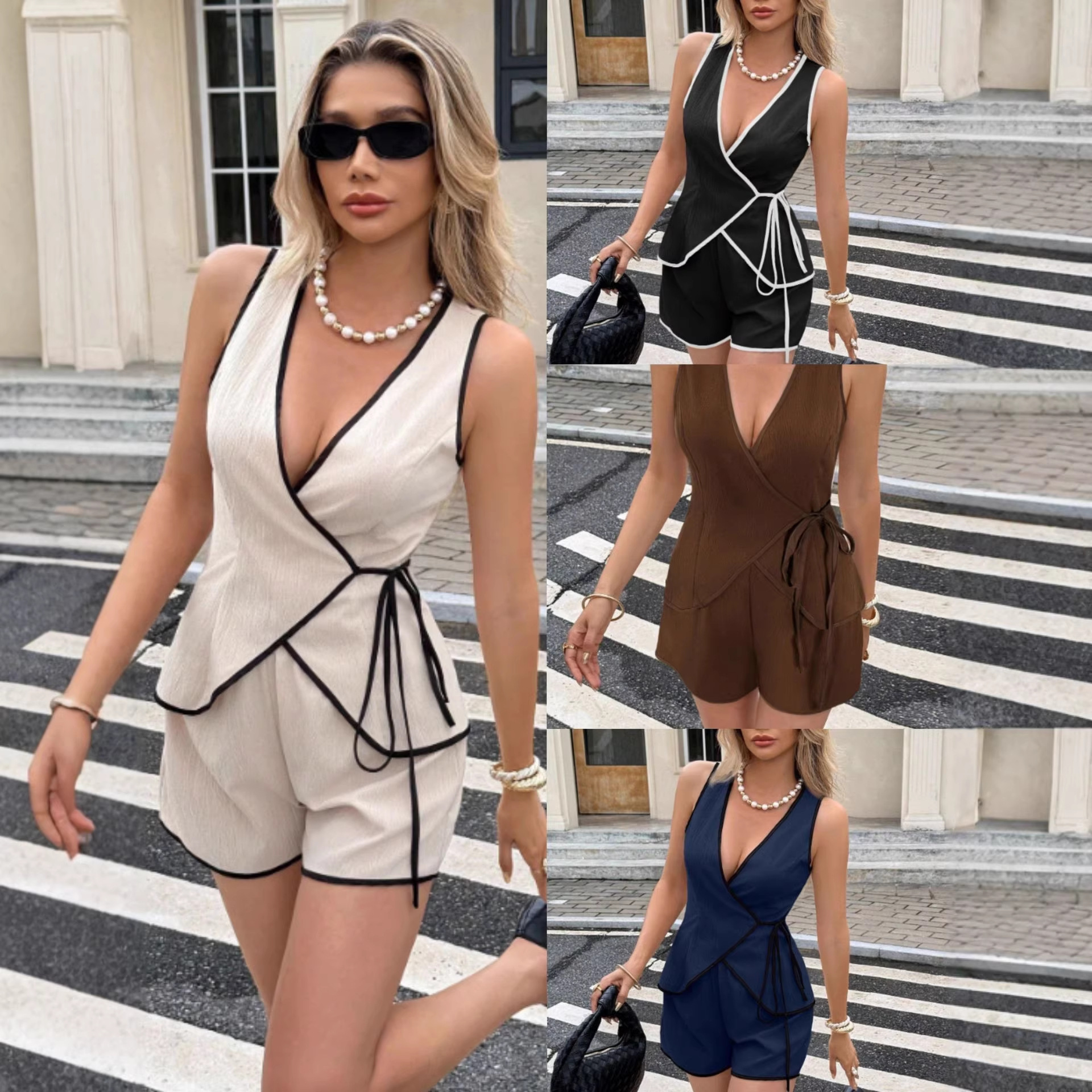 欧美外贸2026夏亚马逊热售V领性感拼色包边系带无袖背心短裤套装