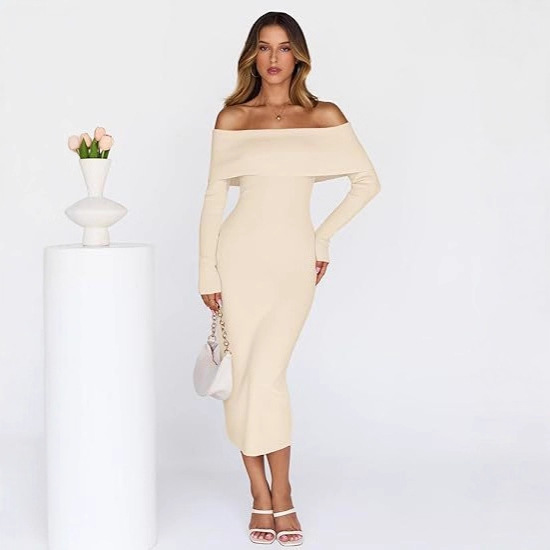 欧美跨境女士春秋季露肩修身毛衣长袖优雅俱乐部派对中长款连衣裙