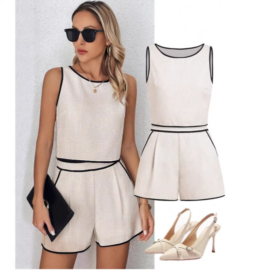 欧美外贸亚马逊2026夏季新款女装撞色边饰简约休闲无袖圆领裤套装