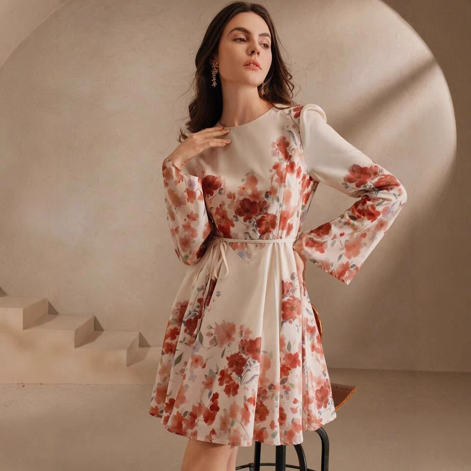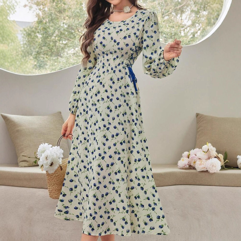 欧美外贸秋冬女装圆领长袖花卉印花系带收腰碎花甜美清新连衣裙