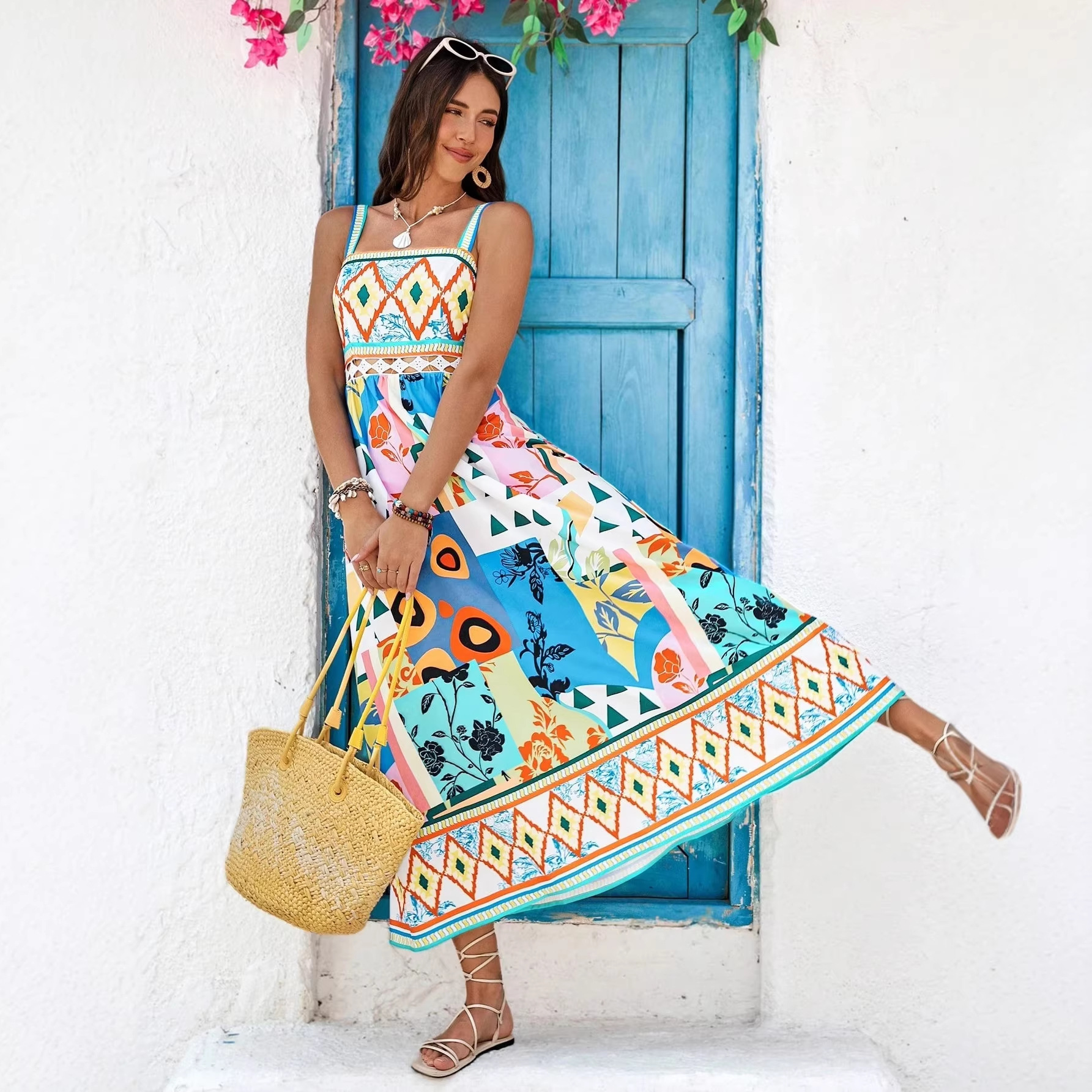 欧美跨境2025新款女装时尚印花系带肩带束腰节日度假风长款连衣裙