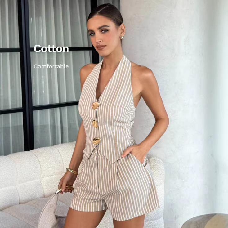 欧美外贸2026亚马逊高端气质V领金属扣挂脖露背无袖马甲短裤套装