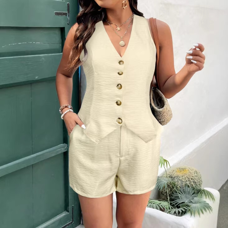 欧美跨境2026外贸独立站亚马逊时尚钮扣圆领无袖背心短裤纯色套装