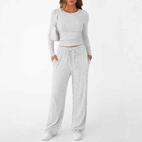 欧美外贸女士两件套家居服长袖微露脐上衣搭配阔腿裤休闲运动服