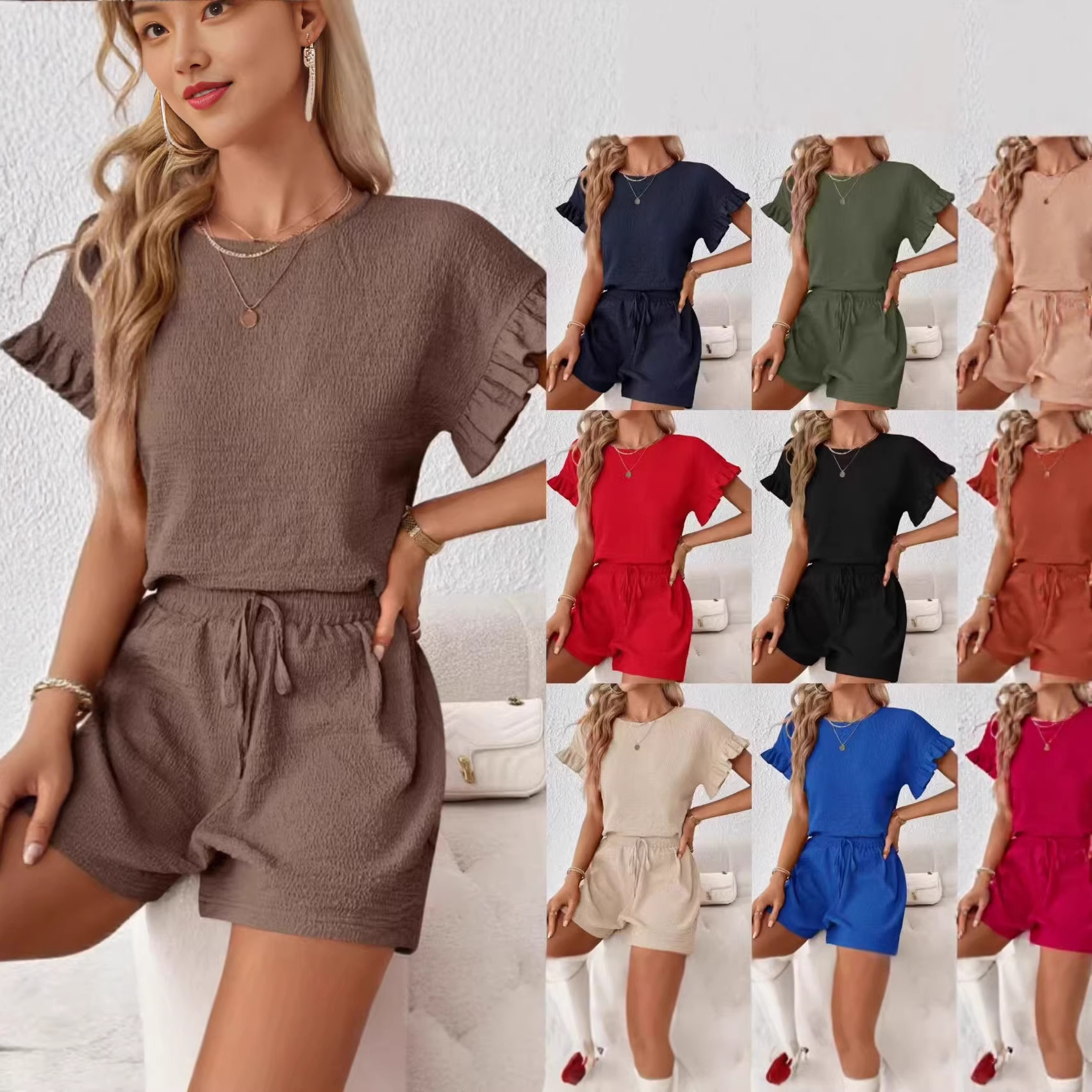 欧美外贸2026夏季亚马逊褶皱布荷叶边袖休闲度假上衣短裤两件套装