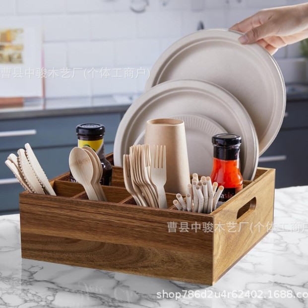 跨境实木家用收纳盒客厅桌面调味瓶整理摆放盒餐厅餐具木制储存盒