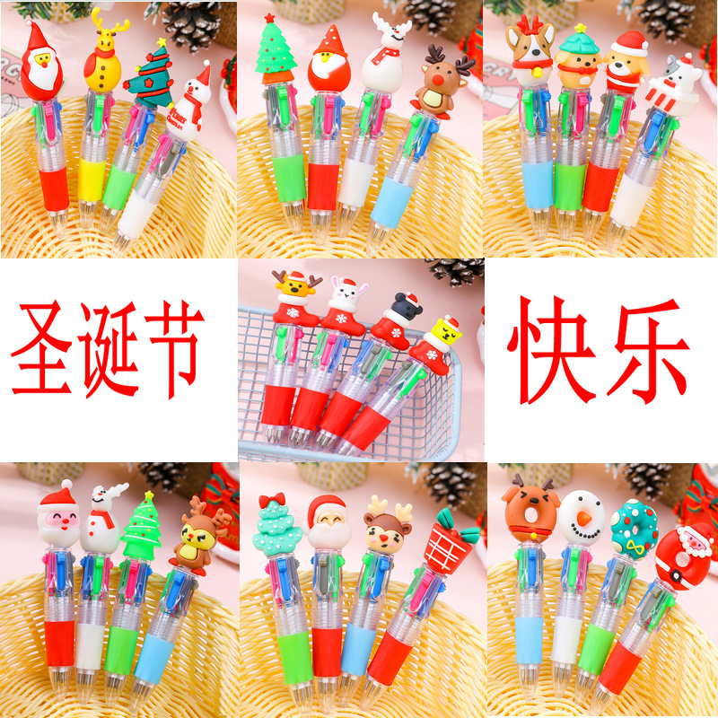 圣诞迷你四色圆珠笔卡通小鹿老人4色油笔手账彩色按动笔学生礼物