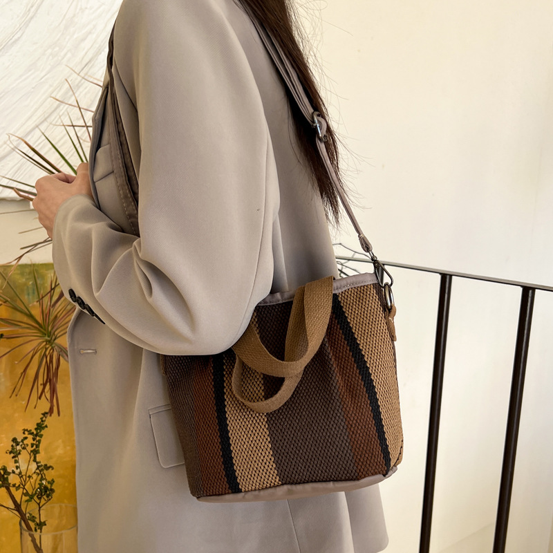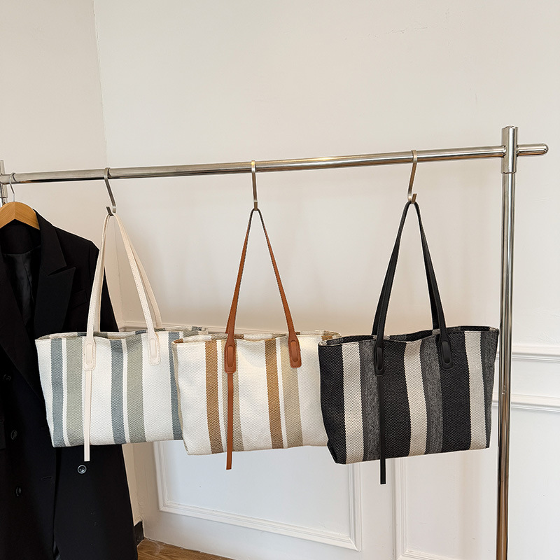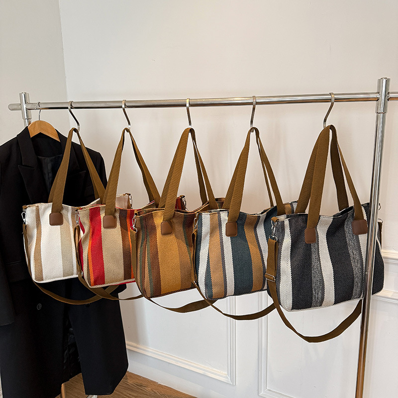 2025新款大包包女时尚条纹帆布包通勤手提托特包潮单肩斜挎妈咪包