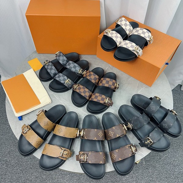 跨境外贸25新款欧美沙滩拖鞋女外穿平底金属扣双扣带字母凉拖鞋