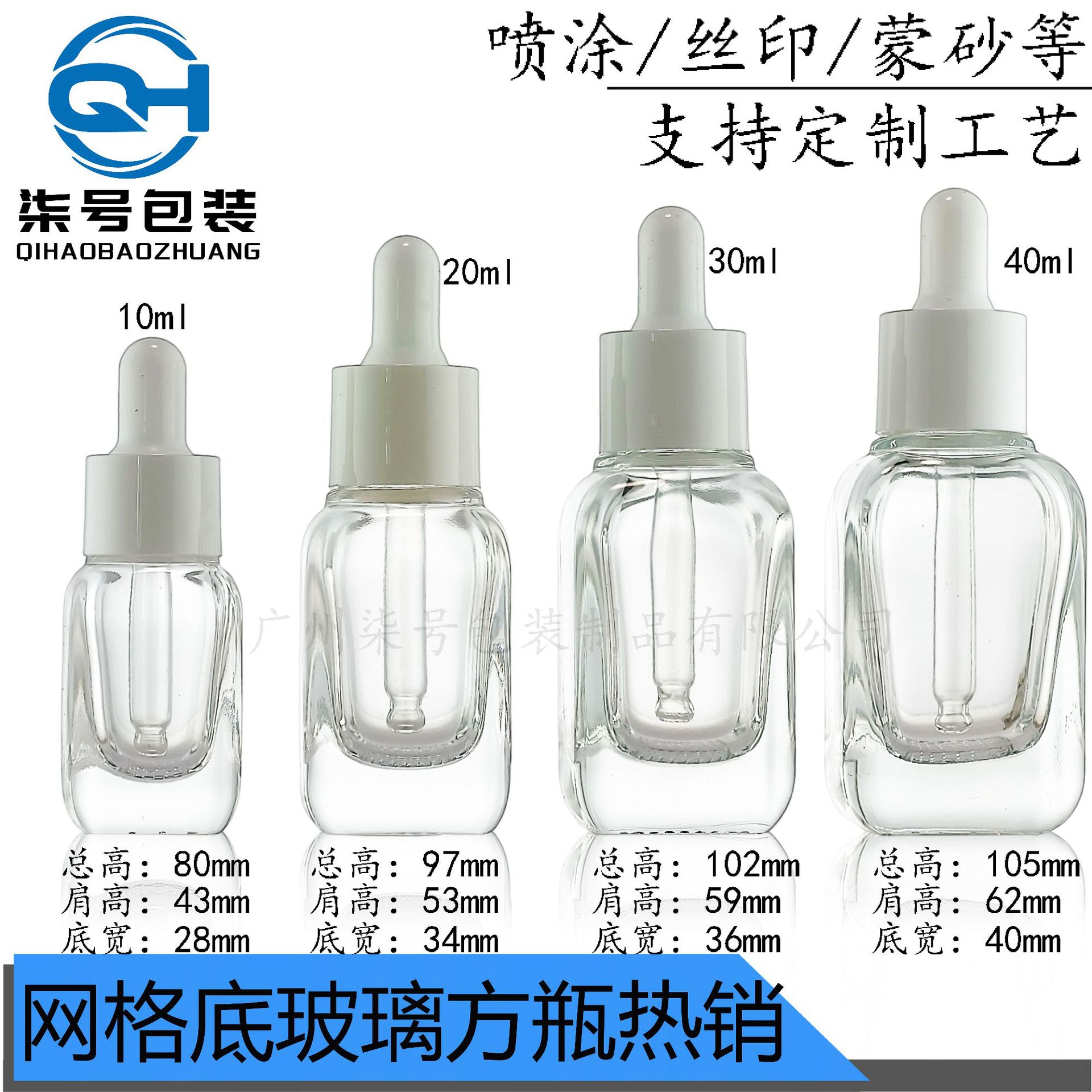 10ml20ml方形精华瓶厚壁网格底瓶30ml40ml滴管精油瓶透明瓶现货