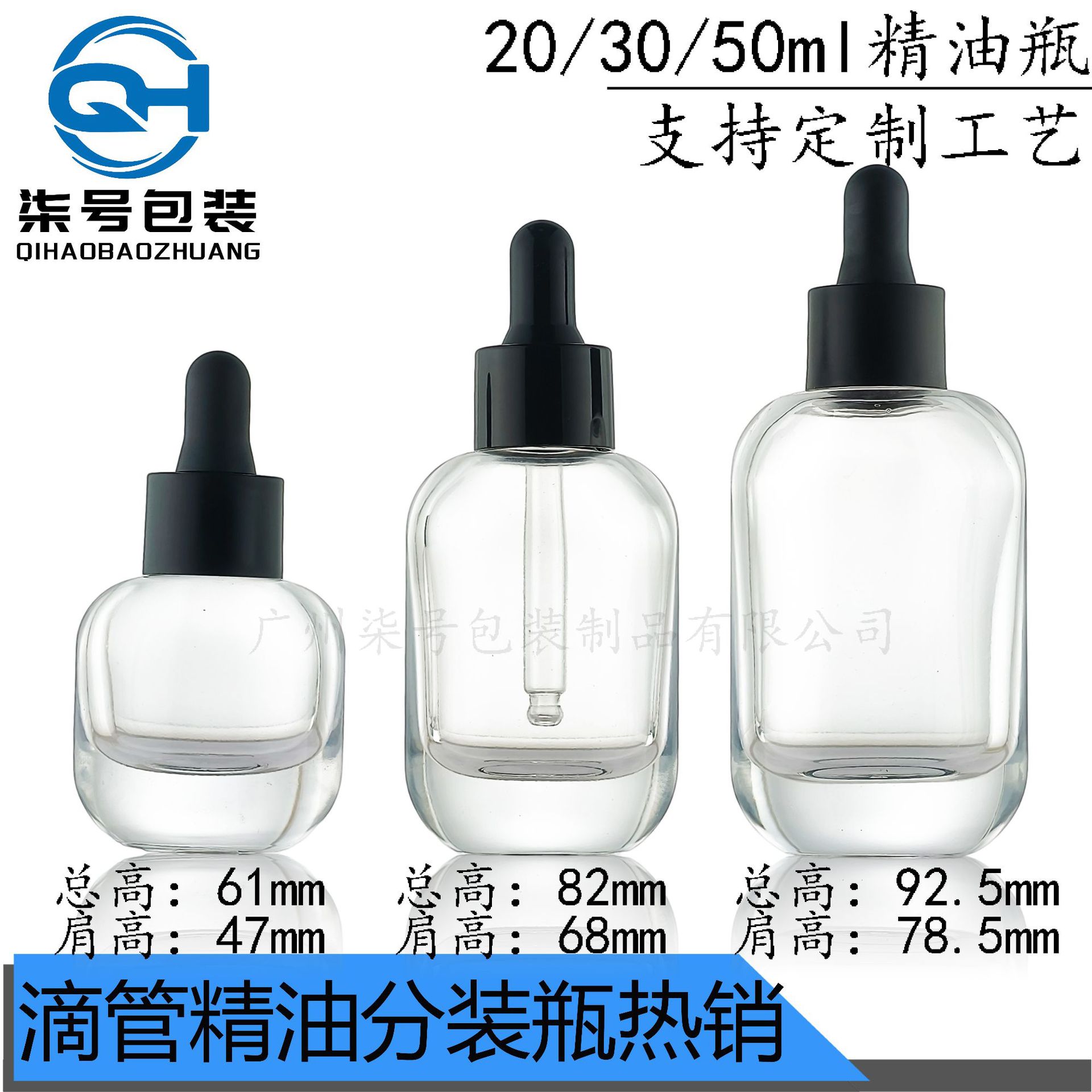 20-50ml扁方圆肩滴管精油瓶透明厚底精华原液玻璃瓶化妆品分装瓶