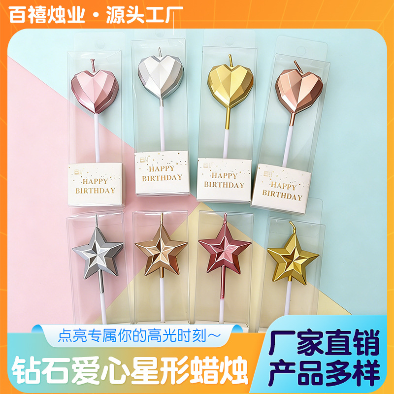 网红钻石爱心五角星生日蜡烛镀金星星心形浪漫烘焙蛋糕装饰摆件