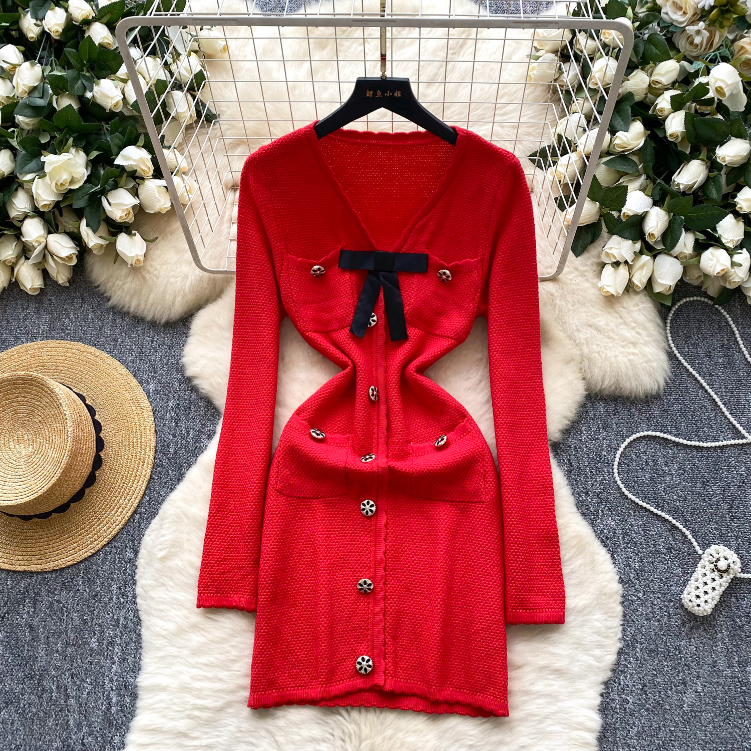 洋气小香风感蝴蝶结V领金属腰长袖针织连衣裙女法式短裙