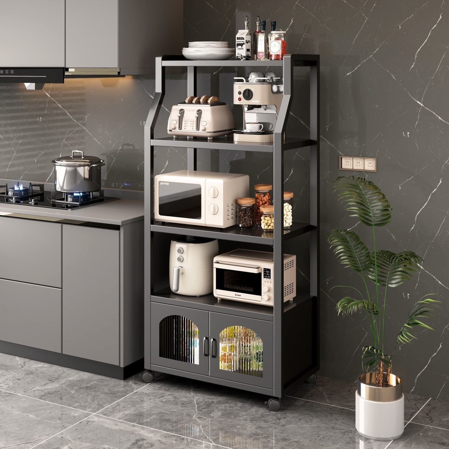 新款带轮落地式厨房置物架微波炉烤箱收纳客厅透明柜门餐边收纳柜