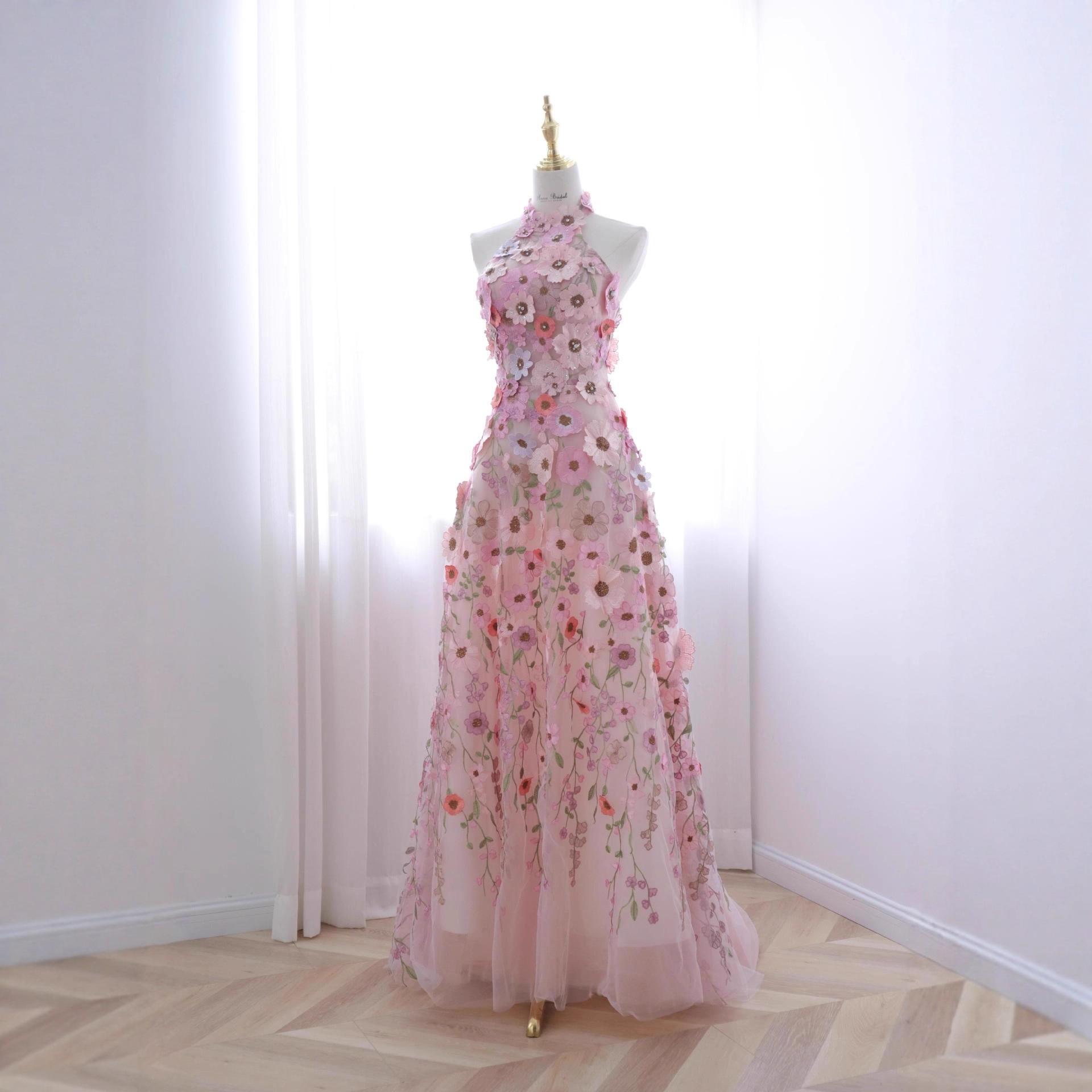 婚礼宴会生日长款礼服重工蕾丝花朵网纱粉色欧美抹胸V领长款A字裙