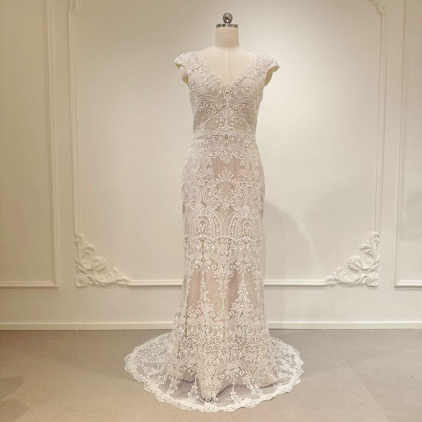 古典绣花蕾丝婚纱轻礼服连衣裙 杏色重工性感V领修身鱼尾款晚礼服