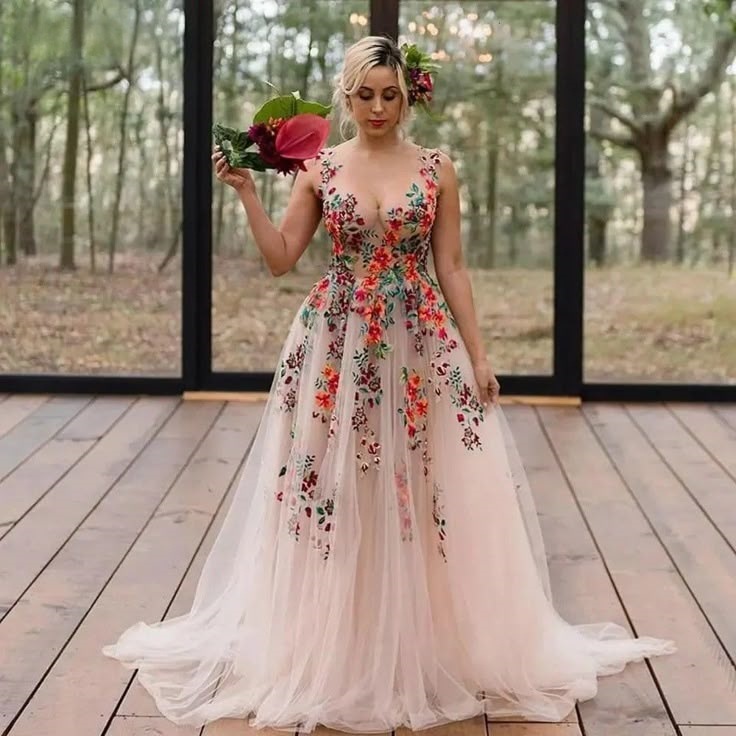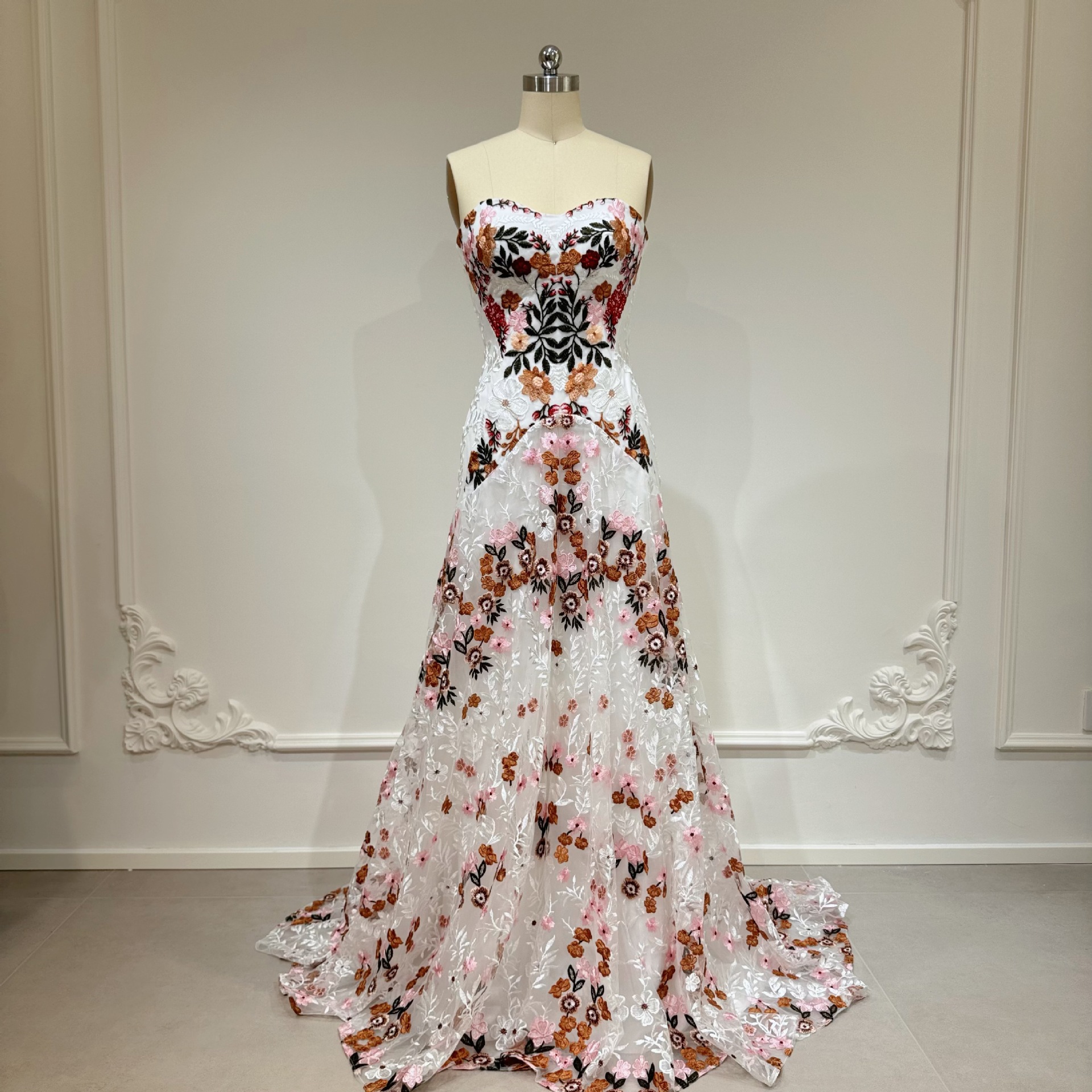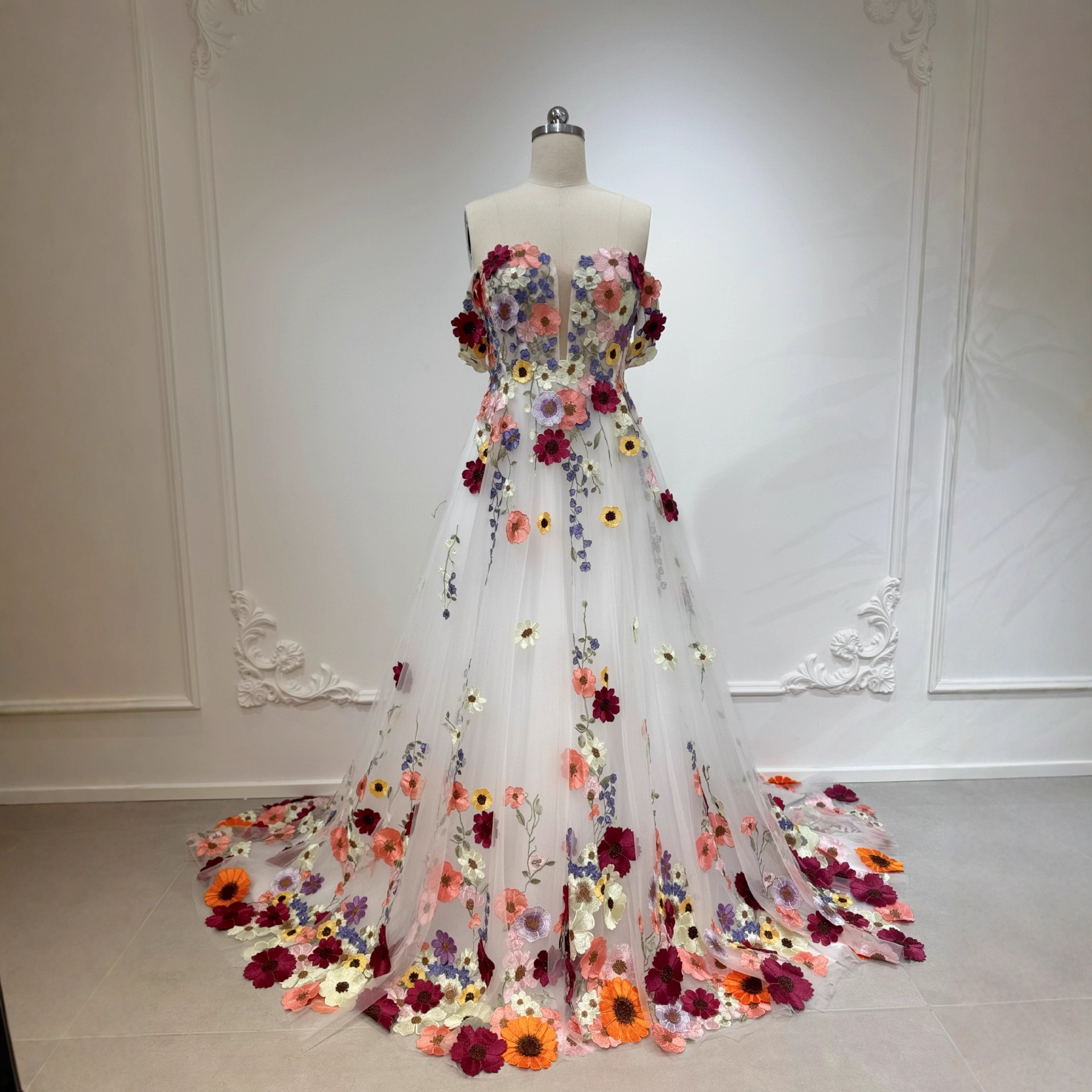 欧美爆款彩色立体花刺绣轻婚纱一字肩重工花朵森系旅拍花朵连衣裙