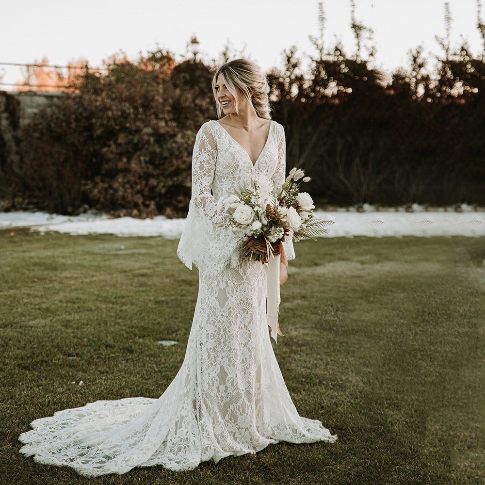 新款新娘长袖迎宾轻纱拖尾裙欧美法式高级感蕾丝鱼尾婚纱礼服定