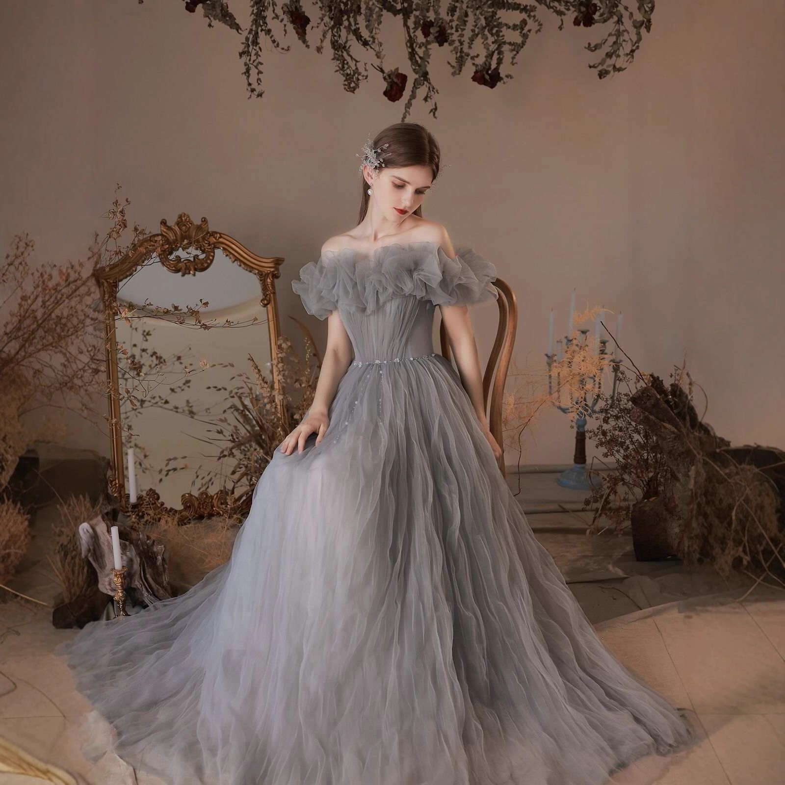 一字肩灰色晚礼服女宴会气质主持人艺考礼服裙轻奢小众高端高级感