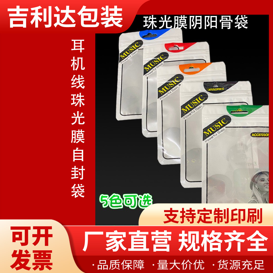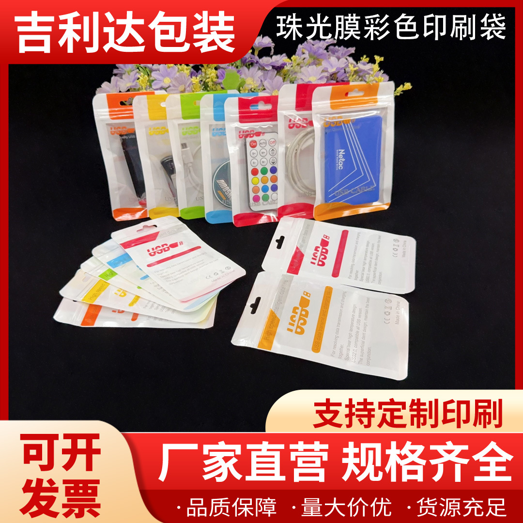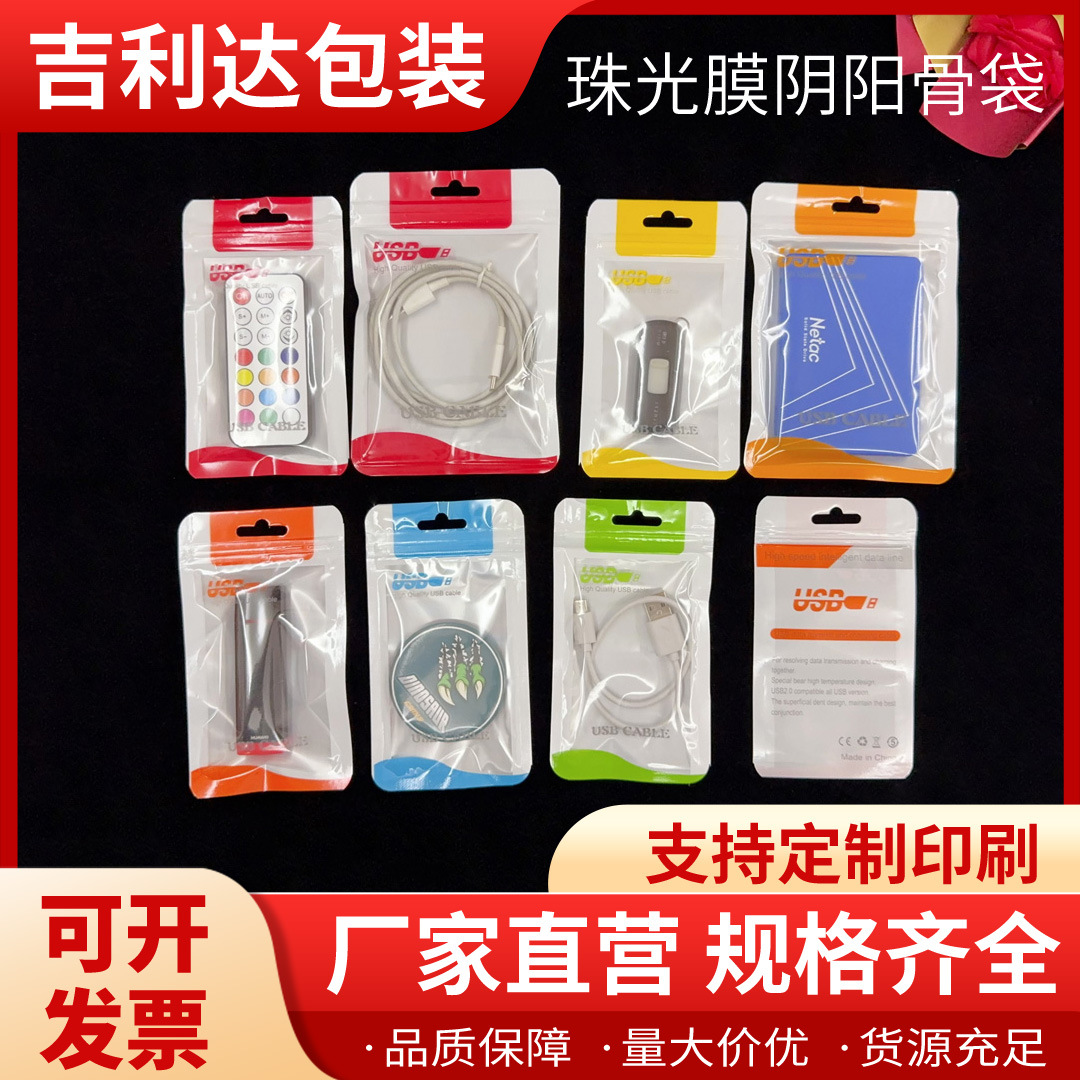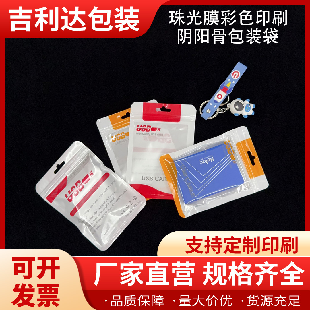 珠光膜自封口彩色印刷阴阳骨包装袋透明面USB数据线通用压骨袋