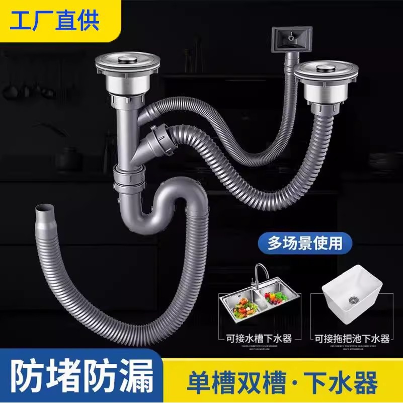 厨房水槽下水器不锈钢+塑料洗菜盆排水管套装弯曲防堵下水管配件