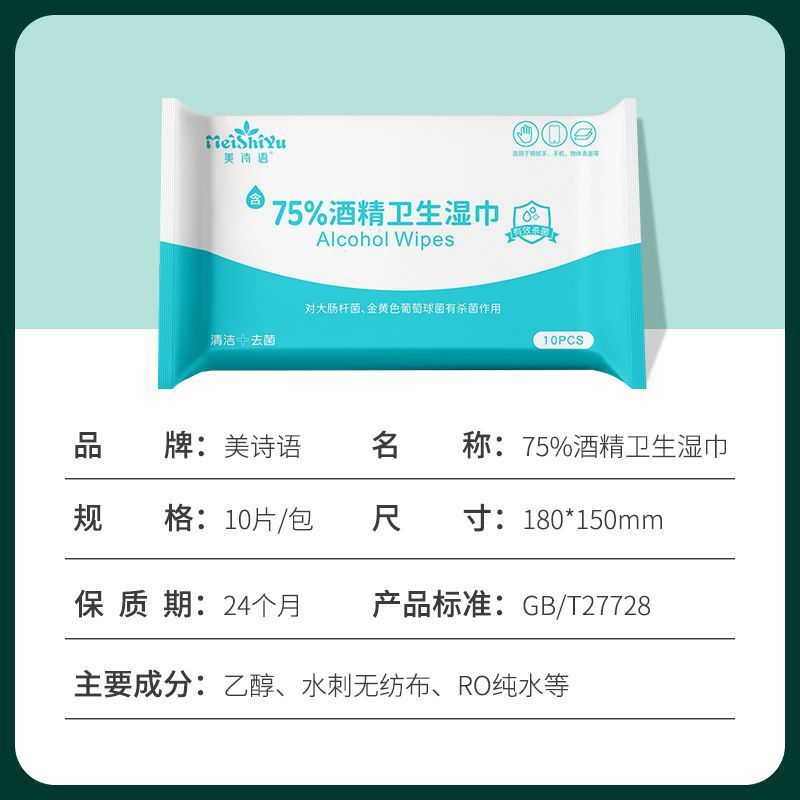 美诗语75度酒精消毒湿巾10片家庭清洁湿巾旅行小包便携卫生湿纸巾