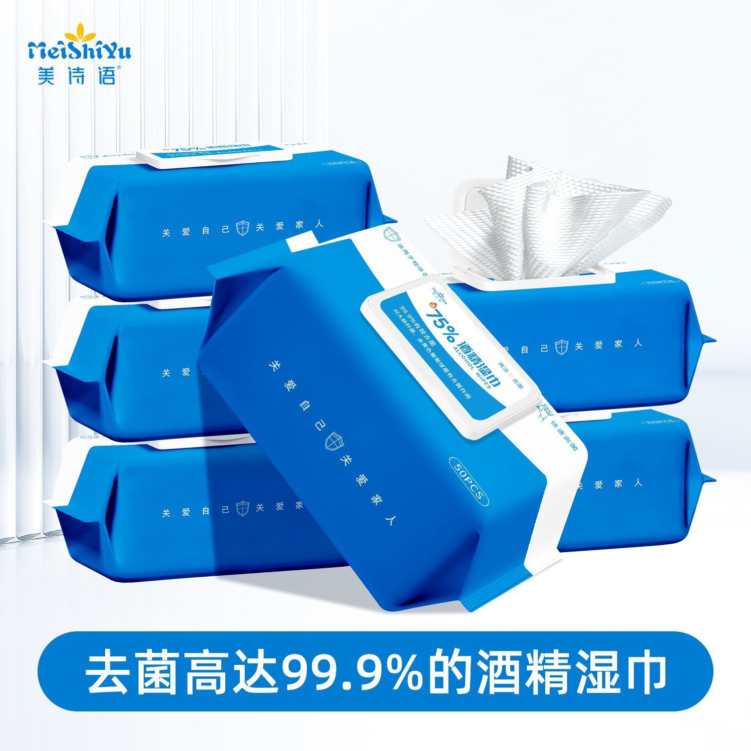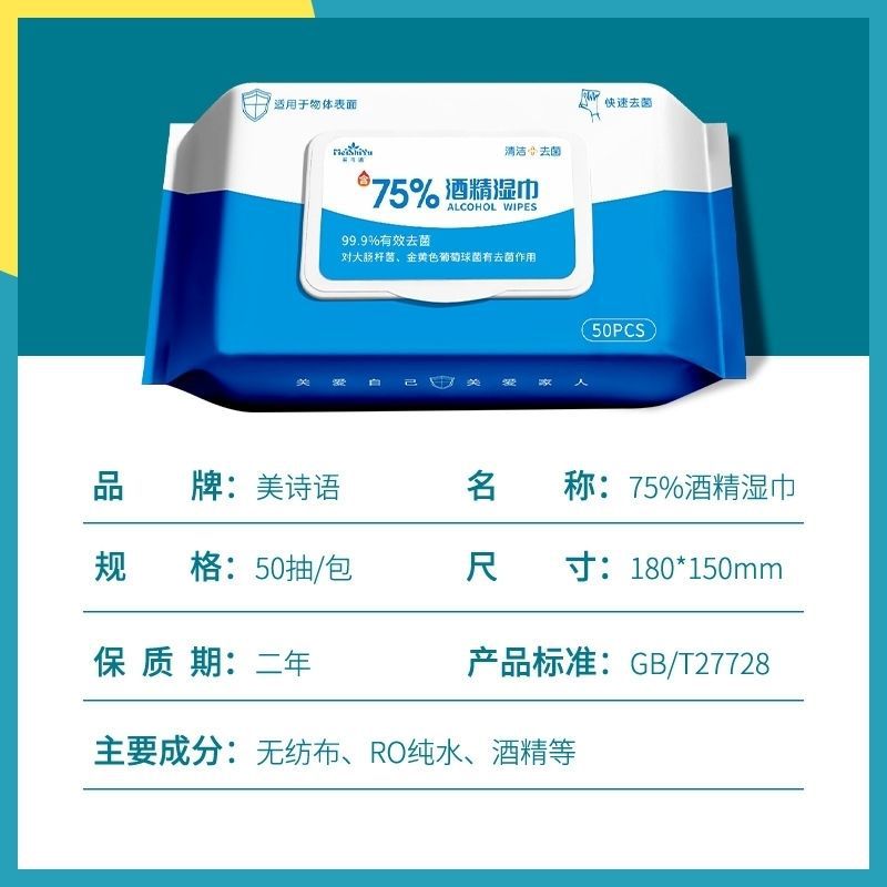 美诗语含75酒精湿巾大包装50抽家用消毒杀菌小包便携式擦手湿纸巾
