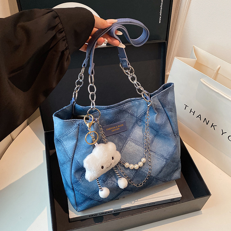 韩版简约斜跨包女2025新款牛仔布包单肩时尚菱格链条小方包腋下包