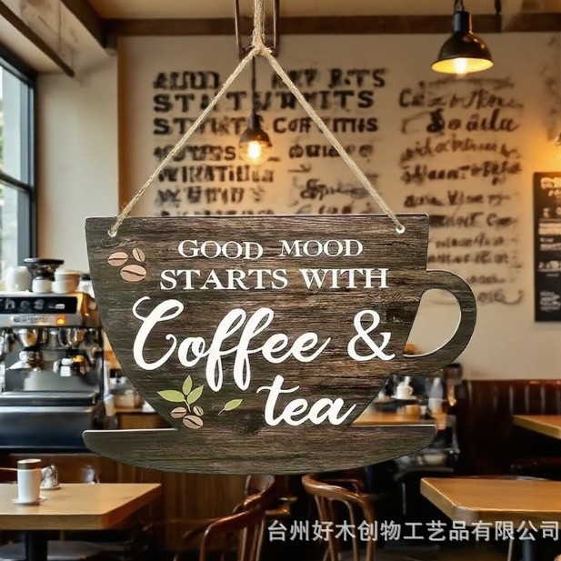创意咖啡杯形挂牌乡村风咖啡厅标语装饰木制工艺品圆形挂牌悬挂式