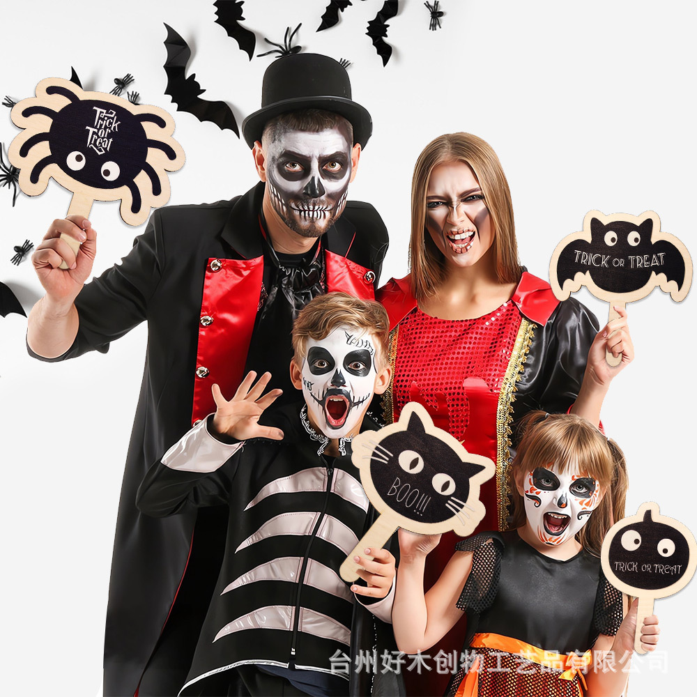 爆款万圣节木质卡通南瓜蜘蛛手拿牌手举牌鬼节派对装饰手持拍照道