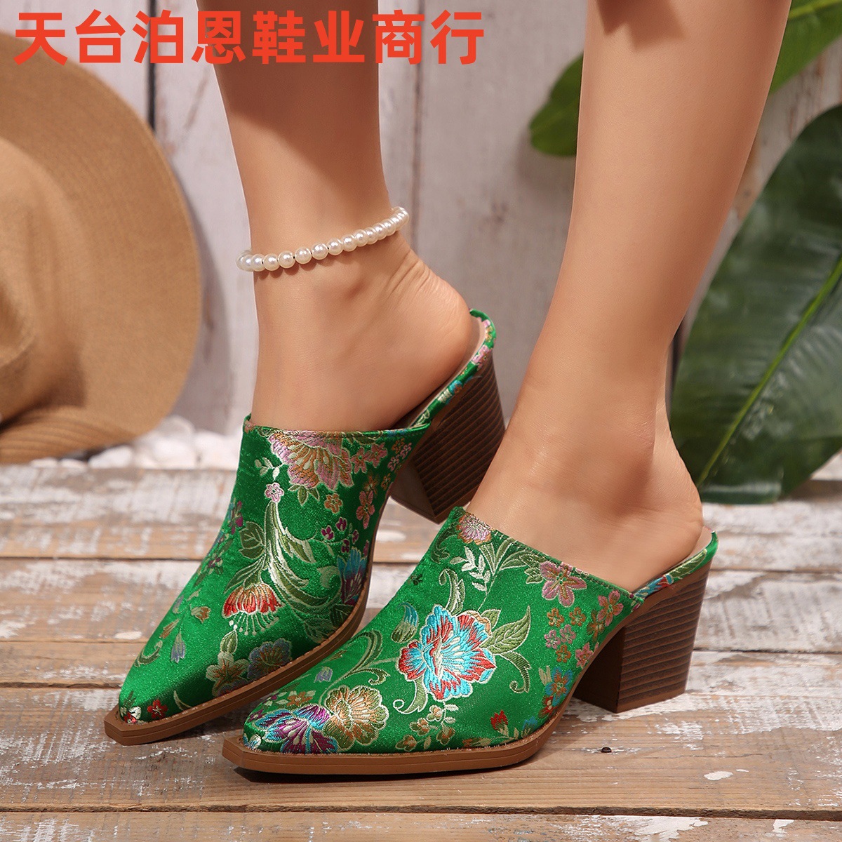 欧美时尚新款复古绸缎刺绣高跟拖鞋外贸粗跟尖头大码女式时装拖鞋
