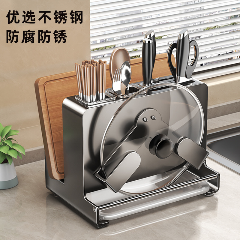 新款不锈钢厨房刀架筷子笼菜板锅盖一体多功能台面沥水收纳置物架