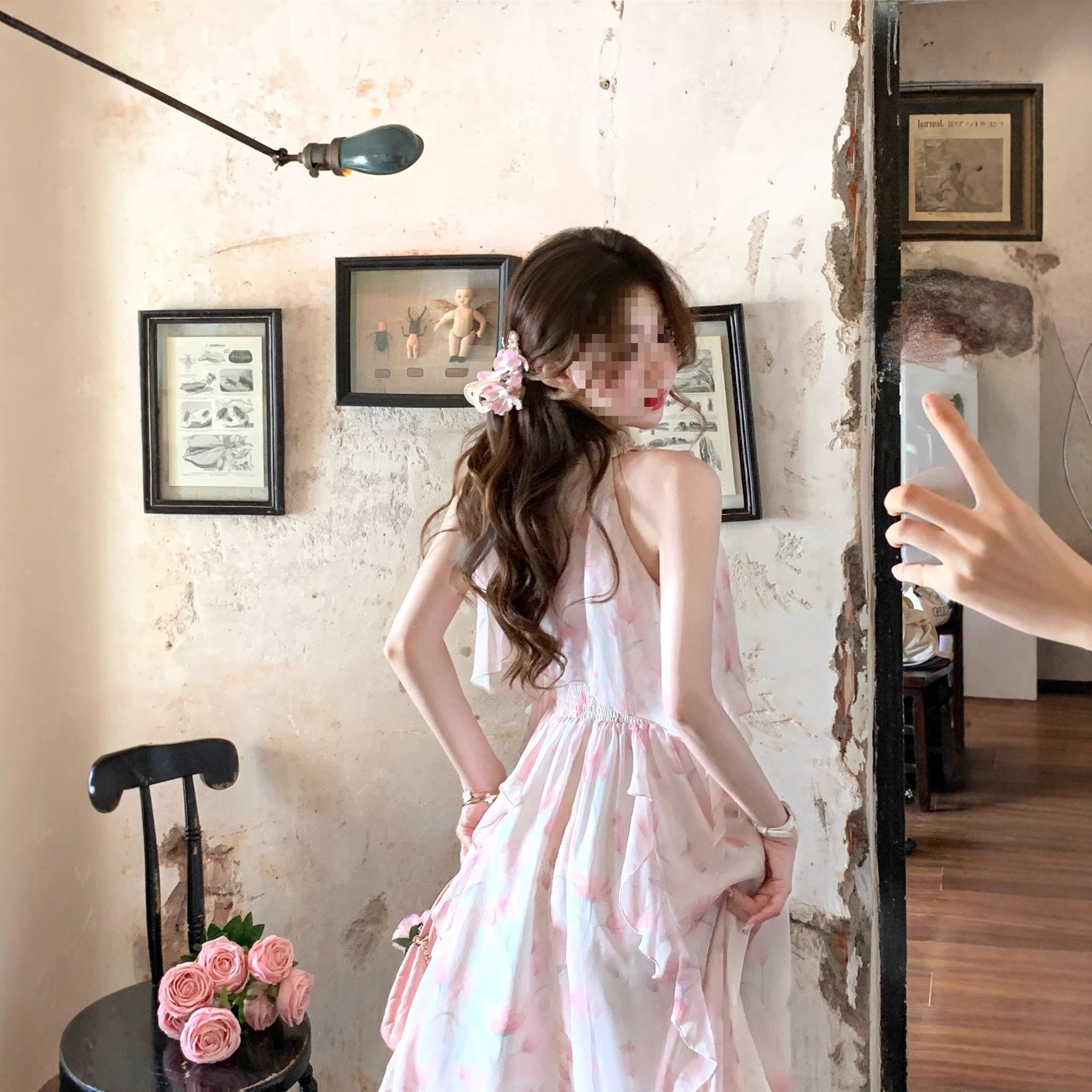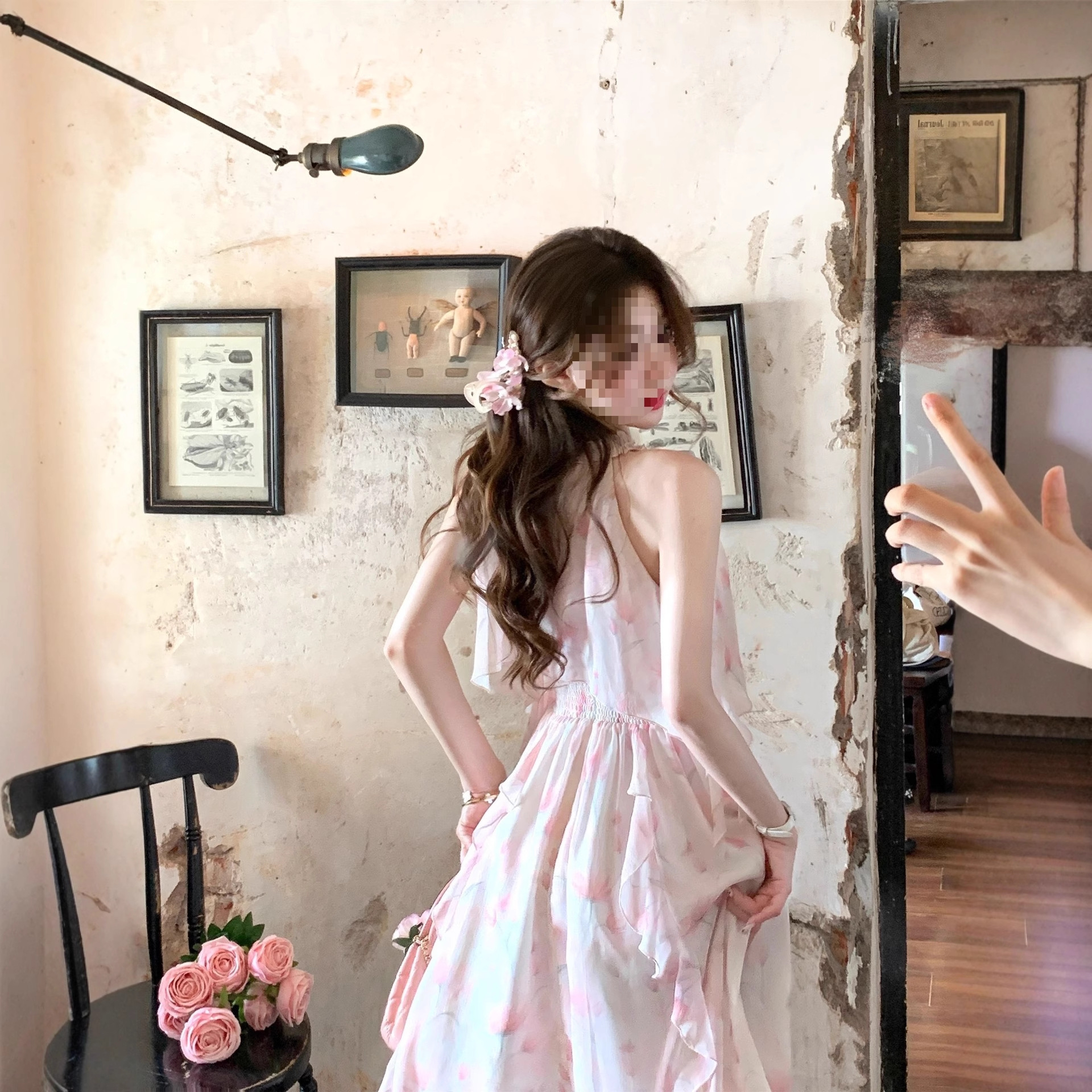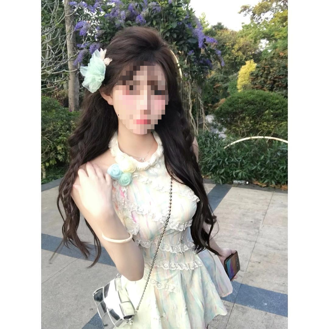 法式浪漫仙气晕染挂脖不规则度假粉色碎花长裙2025夏季新款淑女裙