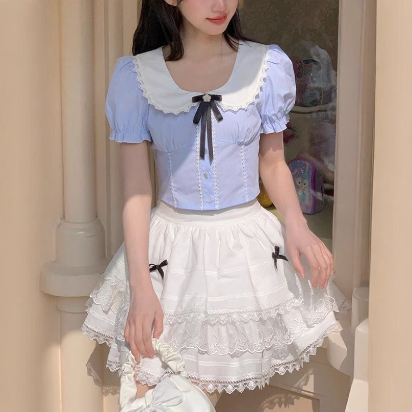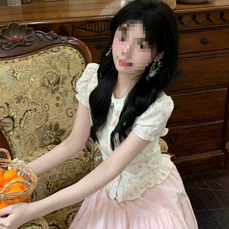 法式一整套甜美可爱夏季短袖搭配娃娃衬衫高腰超仙粉色半身裙套装