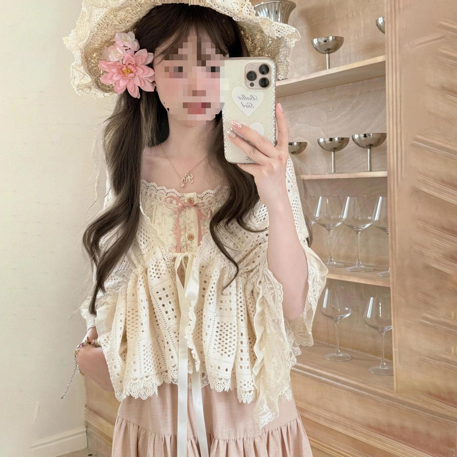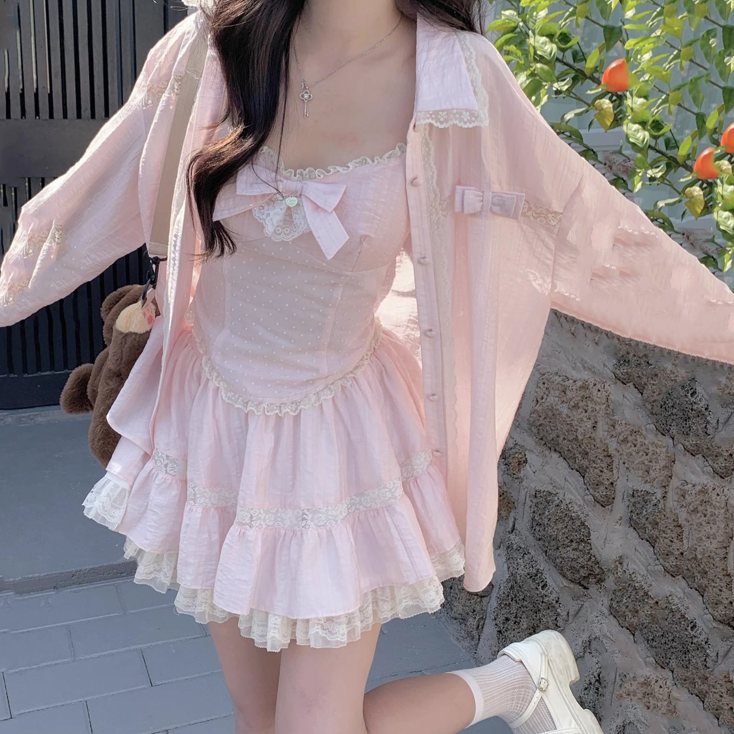 新款甜美衬衫宽松小众吊带连衣裙镂空背心短裙三件套蝴蝶结丝光