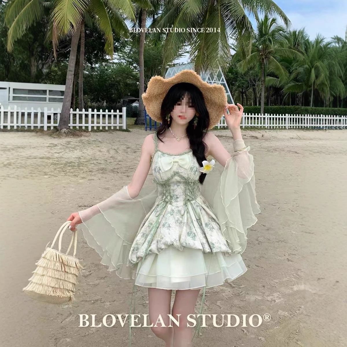 季夏之声 森林精灵印花收腰大蝴蝶结花苞公主连衣裙开衫两件套