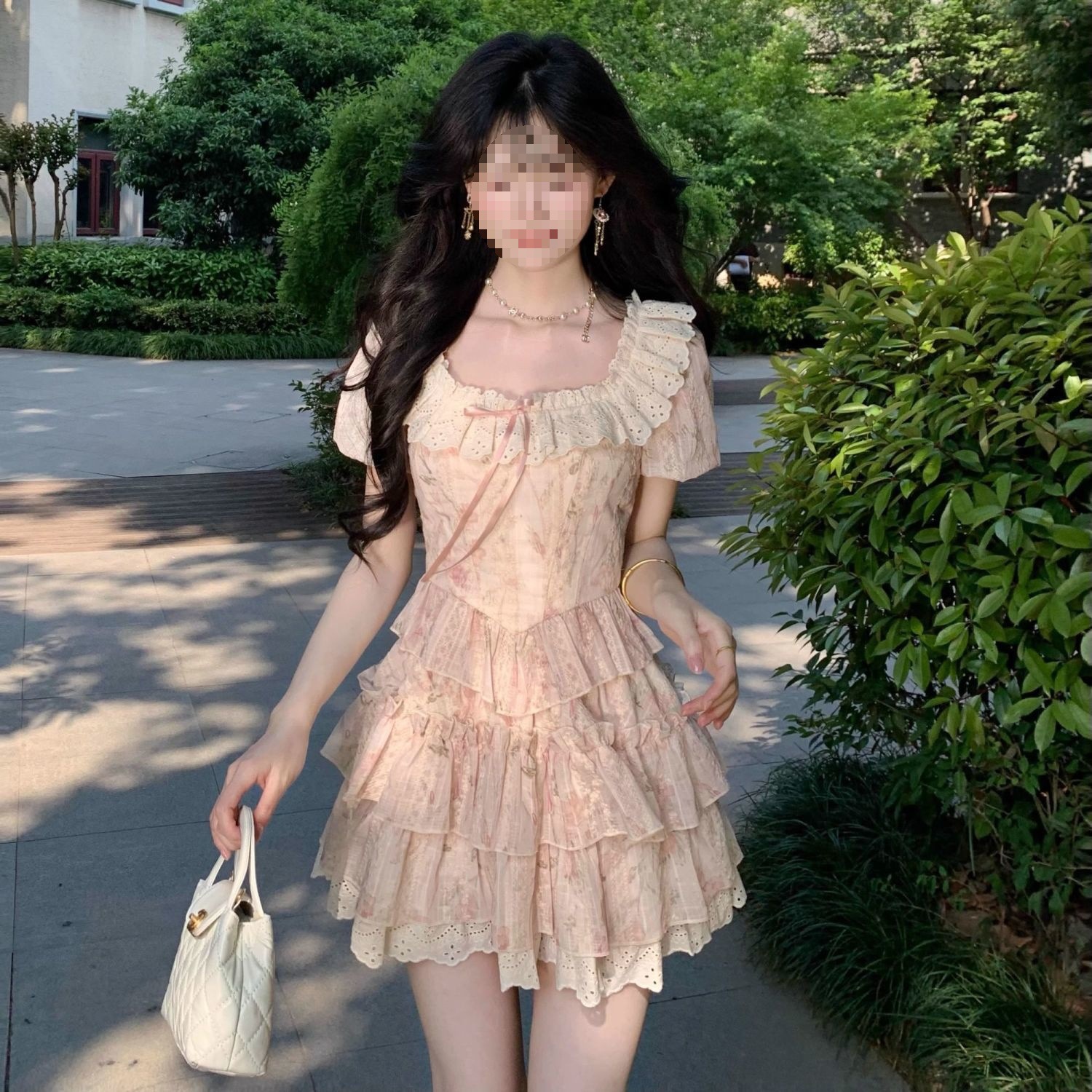 夏季新款气质小众设计别致法式洋气复古绑带设计感收腰蛋糕连衣裙