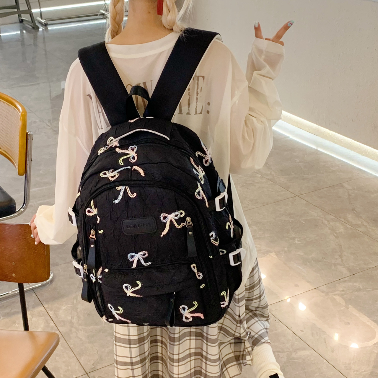 潮牌双肩学生尼龙防泼水女可爱蝴蝶结女士休闲背包