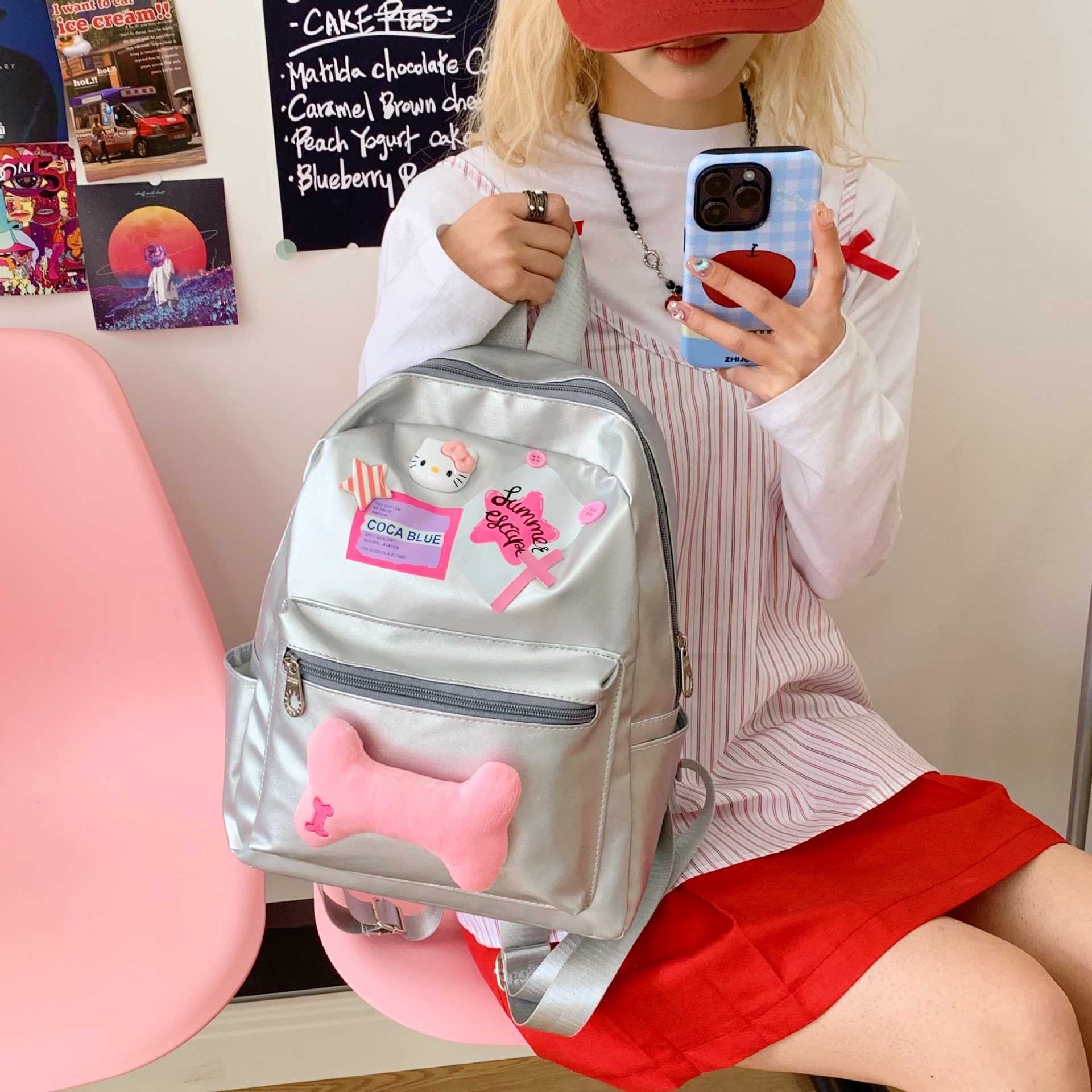 万人收藏新款原创甜辣妹银色pu背包粉色星星骨头双肩包