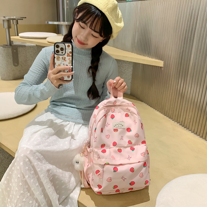 跨境草莓印花新款韩版女士休闲百搭大容量甜美高颜值双肩背