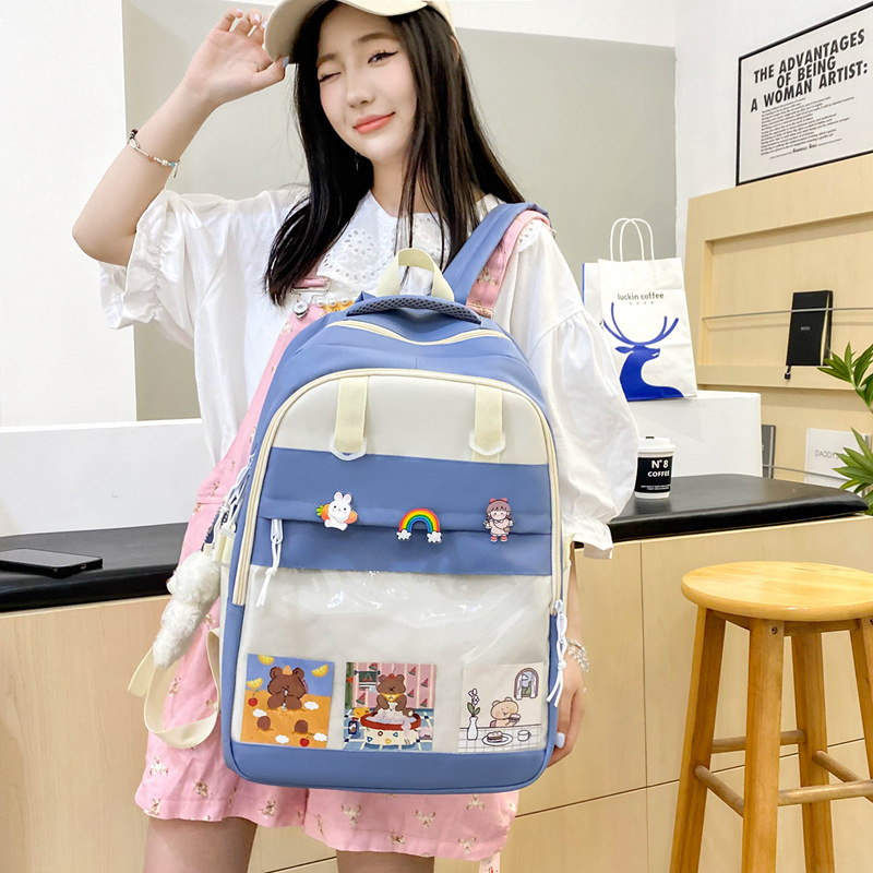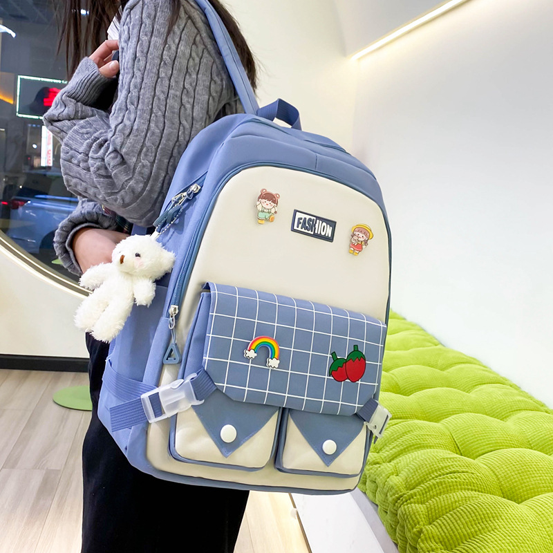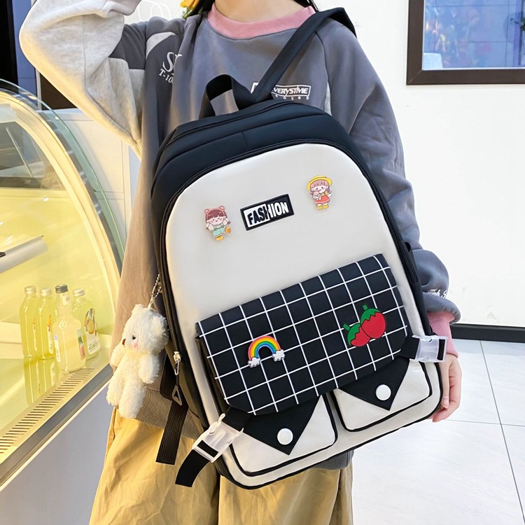 森系韩版学生书包大容量撞色双肩包五件套初中高中小学生背包